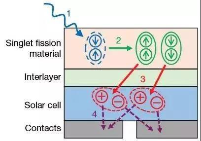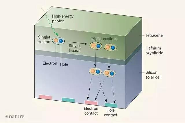 在太陽能電池中,光子激發(fā)材料分子釋放電子,產(chǎn)生電流。通常一個光子只能激發(fā)出一個電子,高能光子的剩余能量會以熱量的形式散失。 此前人們發(fā)現(xiàn),在并四苯等某些有機材料里,一個分子吸收一個高能光子后,可將部分能量轉移給另一個分子,最終產(chǎn)生兩個電子,這種現(xiàn)象稱為“單線態(tài)激子裂變”。理論上,在硅電池上覆蓋一層并四苯,就能用一個高能光子獲得兩個電子,但如何讓“單線態(tài)激子裂變”產(chǎn)生的兩個電子轉移到硅材料中是一個關鍵難題。 為了保證電池效率和耐久性,硅材料必須有表面鈍化層。并四苯中產(chǎn)生的電子必須穿過鈍化層,才能到達硅材料。相對于電子轉移能力來說,目前的鈍化層都太厚了。 新方案的關鍵是用氮氧化鉿對硅材料進行鈍化,得到的鈍化層厚度僅0.8納米(1納米等于十億分之一米),可容許更多電子通過。研究表明,并四苯每吸收一個光子,平均有1.3個電子可穿過氮氧化鉿鈍化層,轉移到硅材料里。研究人員說,新電池效率遠未達到理論極限,尚需改進,但試驗證明了其中的關鍵步驟行之有效。該方案沒有引入復雜的設計,而且可能使電池總體上更薄。 |