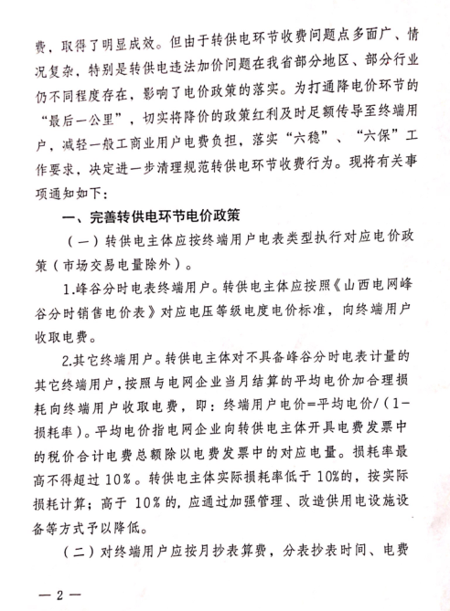 | 山西省進(jìn)一步清理規(guī)范轉(zhuǎn)供電環(huán)節(jié)收費(fèi)行為 |