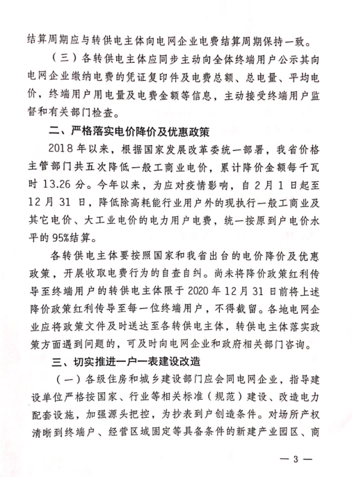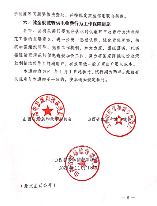 山西省發(fā)改委、住建廳、市場(chǎng)監(jiān)管局聯(lián)合印發(fā)通知,決定進(jìn)一步清理規(guī)范轉(zhuǎn)供電環(huán)節(jié)收費(fèi)行為,減輕企業(yè)負(fù)擔(dān)。2018年以來(lái),根據(jù)國(guó)家發(fā)改委統(tǒng)一部署,山西省價(jià)格主管部門共五次降低一般工商業(yè)電價(jià),累計(jì)降價(jià)金額每千瓦時(shí)13.26分。今年以來(lái),為應(yīng)對(duì)疫情影響,自2月1日起至12月31日,山西省降低除高耗能行業(yè)用戶外的現(xiàn)執(zhí)行一般工商業(yè)及其他電價(jià)、大工業(yè)電價(jià)的電力用戶電費(fèi),統(tǒng)一按原到戶電價(jià)水平的95%結(jié)算。 通知要求,各轉(zhuǎn)供電主體要嚴(yán)格按照國(guó)家和山西省出臺(tái)的電價(jià)降價(jià)及優(yōu)惠政策,開展收取電費(fèi)行為的自查自糾。尚未將降價(jià)政策紅利傳導(dǎo)至終端用戶的,限于2020年12月31日前將降價(jià)政策紅利傳導(dǎo)至每一位終端用戶,不得截留。詳情如下: