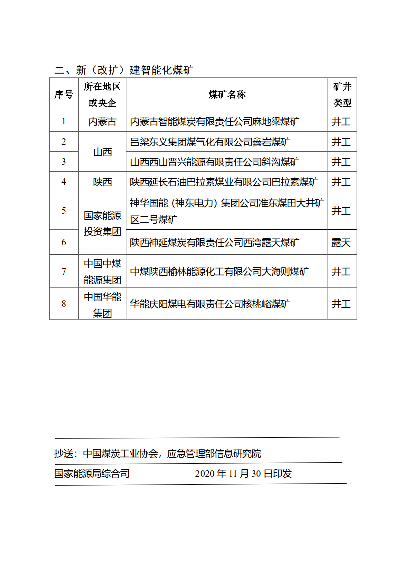 為深入貫徹落實習(xí)近平總書記“四個革命、一個合作”能源安全新戰(zhàn)略,加快推進煤炭行業(yè)供給側(cè)結(jié)構(gòu)性改革,推動智能化技術(shù)與煤炭產(chǎn)業(yè)融合發(fā)展,提升煤礦智能化和本質(zhì)安全水平,從根本上消除事故隱患,按照《關(guān)于加快煤礦智能化發(fā)展的指導(dǎo)意見》(發(fā)改能源〔2020〕283號)要求,國家能源局、國家煤礦安全監(jiān)察局審核確定內(nèi)蒙古雙欣礦業(yè)有限公司楊家村煤礦等71處煤礦,作為國家首批智能化示范建設(shè)煤礦。 國家能源局 國家煤礦安全監(jiān)察局關(guān)于開展首批智能化示范煤礦建設(shè)的通知 國能發(fā)煤炭﹝2020﹞63號 各產(chǎn)煤省、自治區(qū)、直轄市、新疆生產(chǎn)建設(shè)兵團發(fā)展改革委(能源局)、煤礦安全監(jiān)管部門,有關(guān)中央企業(yè): 為深入貫徹落實習(xí)近平總書記“四個革命、一個合作”能源安全新戰(zhàn)略,加快推進煤炭行業(yè)供給側(cè)結(jié)構(gòu)性改革,推動智能化技術(shù)與煤炭產(chǎn)業(yè)融合發(fā)展,提升煤礦智能化和本質(zhì)安全水平,從根本上消除事故隱患,按照《關(guān)于加快煤礦智能化發(fā)展的指導(dǎo)意見》(發(fā)改能源〔2020〕283號)要求,國家能源局、國家煤礦安全監(jiān)察局審核確定內(nèi)蒙古雙欣礦業(yè)有限公司楊家村煤礦等71處煤礦,作為國家首批智能化示范建設(shè)煤礦(名單詳見附件),現(xiàn)向社會公布。有關(guān)事項通知如下: 一、充分認識建設(shè)智能化示范煤礦的重要性。加快推進煤礦智能化建設(shè),是深入貫徹落實習(xí)近平總書記重要指示精神和能源安全新戰(zhàn)略的重要舉措,是推動煤炭工業(yè)轉(zhuǎn)型升級、高質(zhì)量發(fā)展的核心技術(shù)支撐,是實現(xiàn)煤礦減人增效、從根本上消除事故隱患,提高煤礦本質(zhì)安全水平的有效手段。建設(shè)首批智能化示范煤礦,旨在從建設(shè)理念、系統(tǒng)架構(gòu)、智能技術(shù)與裝備、綜合管理、經(jīng)濟投入等方面進行探索與實踐,根據(jù)煤層賦存條件、煤礦類型與規(guī)模,凝練可復(fù)制的智能化建設(shè)模式,盡快實現(xiàn)“系統(tǒng)智能化、智能系統(tǒng)化”,引領(lǐng)帶動全國煤礦智能化建設(shè),從根本上遏制重特大事故發(fā)生,促進煤炭開采方式由炮采、普采和綜采向智采變革,為能源領(lǐng)域“新基建”奠定基礎(chǔ)。 二、加強建設(shè)項目監(jiān)督管理。各省級能源主管部門、煤礦安全監(jiān)管部門和有關(guān)中央企業(yè)要高度重視首批智能化示范煤礦建設(shè),把智能化示范煤礦建設(shè)納入本地區(qū)本單位“十四五”相關(guān)規(guī)劃,列入重點工程任務(wù);建立智能化示范煤礦建設(shè)統(tǒng)籌協(xié)調(diào)推進機制,成立領(lǐng)導(dǎo)小組或工作專班,制定本單位智能化示范煤礦推進工作方案,明確職責(zé)分工,加強對示范建設(shè)項目的指導(dǎo)和跟蹤,積極協(xié)調(diào)解決項目建設(shè)中的困難和問題;借鑒相關(guān)省份和企業(yè)的做法,設(shè)立專項資金,制定配套政策措施,引導(dǎo)社會加大資金投入。 三、落實煤礦企業(yè)主體責(zé)任。煤礦企業(yè)是智能化示范煤礦建設(shè)的第一責(zé)任單位,要做好智能化示范煤礦建設(shè)的人、財、物保障;要加強考察調(diào)研、學(xué)習(xí)交流,對標(biāo)國內(nèi)外煤礦智能化先進技術(shù)裝備、管理理念、服務(wù)模式等,以建設(shè)少人無人智能化示范煤礦為目標(biāo),完善建設(shè)方案,依照工程項目建設(shè)標(biāo)準(zhǔn)規(guī)范,按期保質(zhì)完成建設(shè)任務(wù);要建立與智能化裝備制造企業(yè)、智能化技術(shù)服務(wù)單位之間的合作推進長效機制,及時解決智能化示范煤礦建設(shè)過程中的問題,總結(jié)經(jīng)驗,持續(xù)提升智能化建設(shè)和安全生產(chǎn)水平。有關(guān)中央企業(yè)要發(fā)揮好帶頭作用,高標(biāo)準(zhǔn)、高質(zhì)量建設(shè)智能化示范煤礦。 四、統(tǒng)籌開展項目驗收工作。國家能源局、國家煤礦安全監(jiān)察局將組織編制智能化示范煤礦驗收辦法(指南)。省級能源主管部門、煤礦安全監(jiān)管部門和有關(guān)中央企業(yè)應(yīng)依據(jù)驗收辦法(指南),組織專家對建成的智能化示范煤礦進行驗收。國家能源局、國家煤礦安全監(jiān)察局對驗收后的煤礦進行抽查,并根據(jù)驗收意見和抽查情況,分批確定并公布智能化示范煤礦名單。 五、強化支撐保障能力。中國煤炭工業(yè)協(xié)會等行業(yè)組織要加快開展相關(guān)技術(shù)和管理標(biāo)準(zhǔn)的制定,健全煤礦智能化標(biāo)準(zhǔn)體系,做好智能化示范煤礦的經(jīng)驗總結(jié)和成果推廣;相關(guān)科研院所要加大智能開采技術(shù)和高端裝備研發(fā)力度,提升智能化裝備可靠性和系統(tǒng)穩(wěn)定性;相關(guān)企業(yè)和高等院校要加快培養(yǎng)和引進智能化建設(shè)急需的專業(yè)技術(shù)人才,為智能化煤礦建設(shè)提供智力支持。 六、做好信息報送和宣傳工作。國家能源局、國家煤礦安全監(jiān)察局建立信息報送制度。智能化示范煤礦建設(shè)單位要在2020年12月底前將完善后的智能化示范煤礦建設(shè)方案按程序上報國家能源局,對建設(shè)任務(wù)完成情況要及時